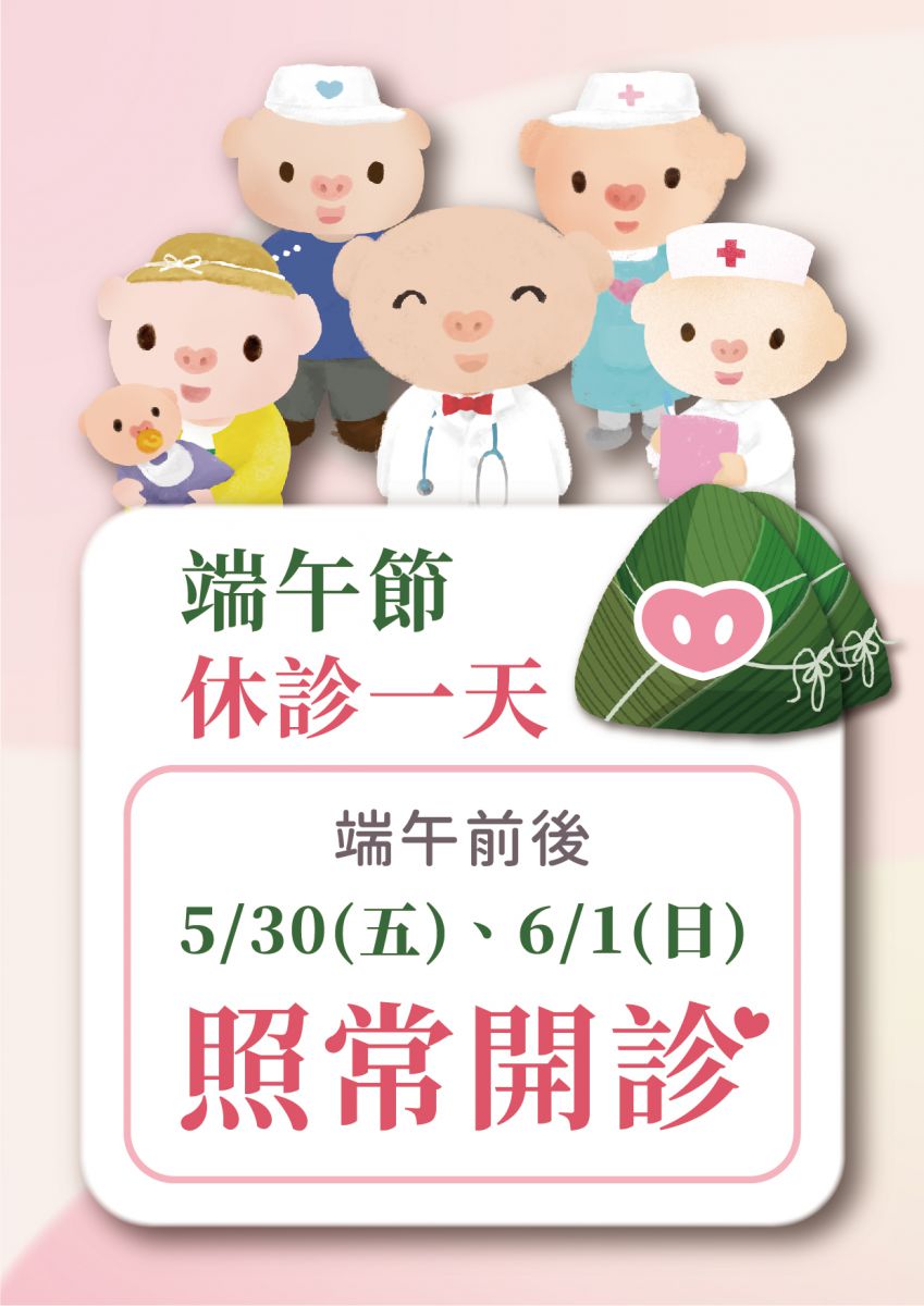 【端午假期門診公告】5/30(五)照常看診,5/31(六)端午節全天休診,6/1(日)恢復看診。