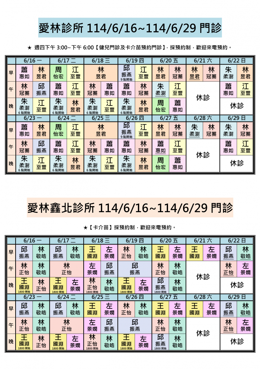 各位親愛的朋友您好:114/6/16-114/6/29兩院區醫師門診公告。