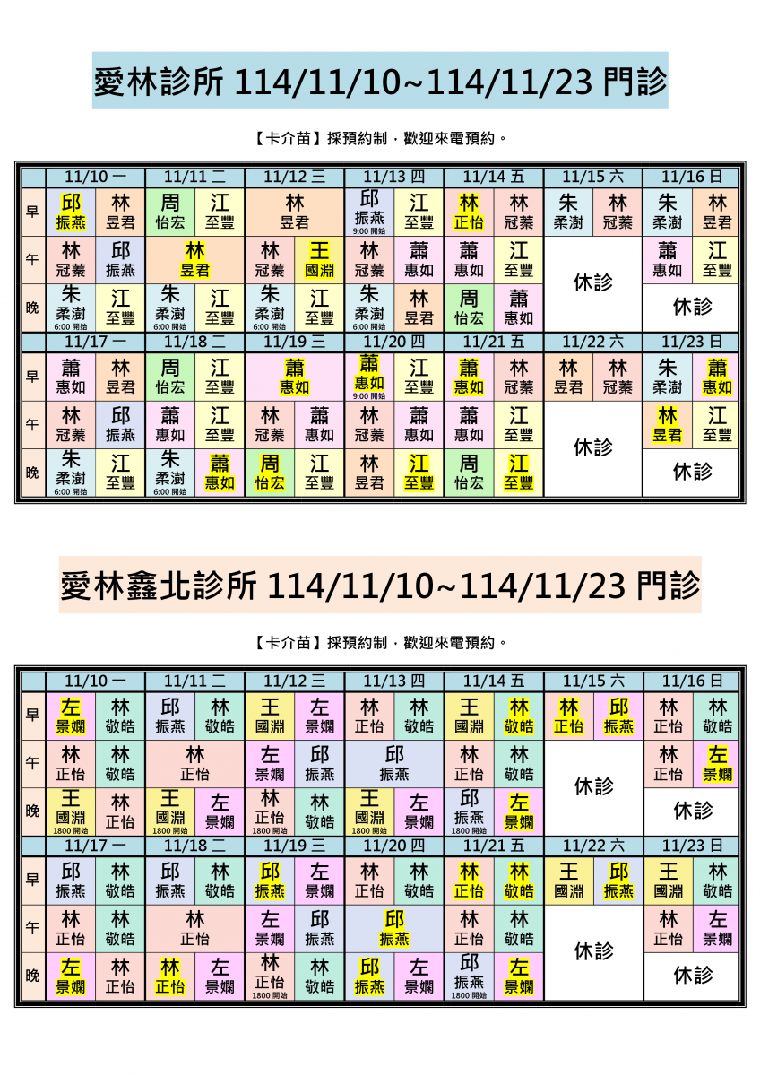各位親愛的朋友您好:114/11/10-114/11/23兩院區醫師門診公告