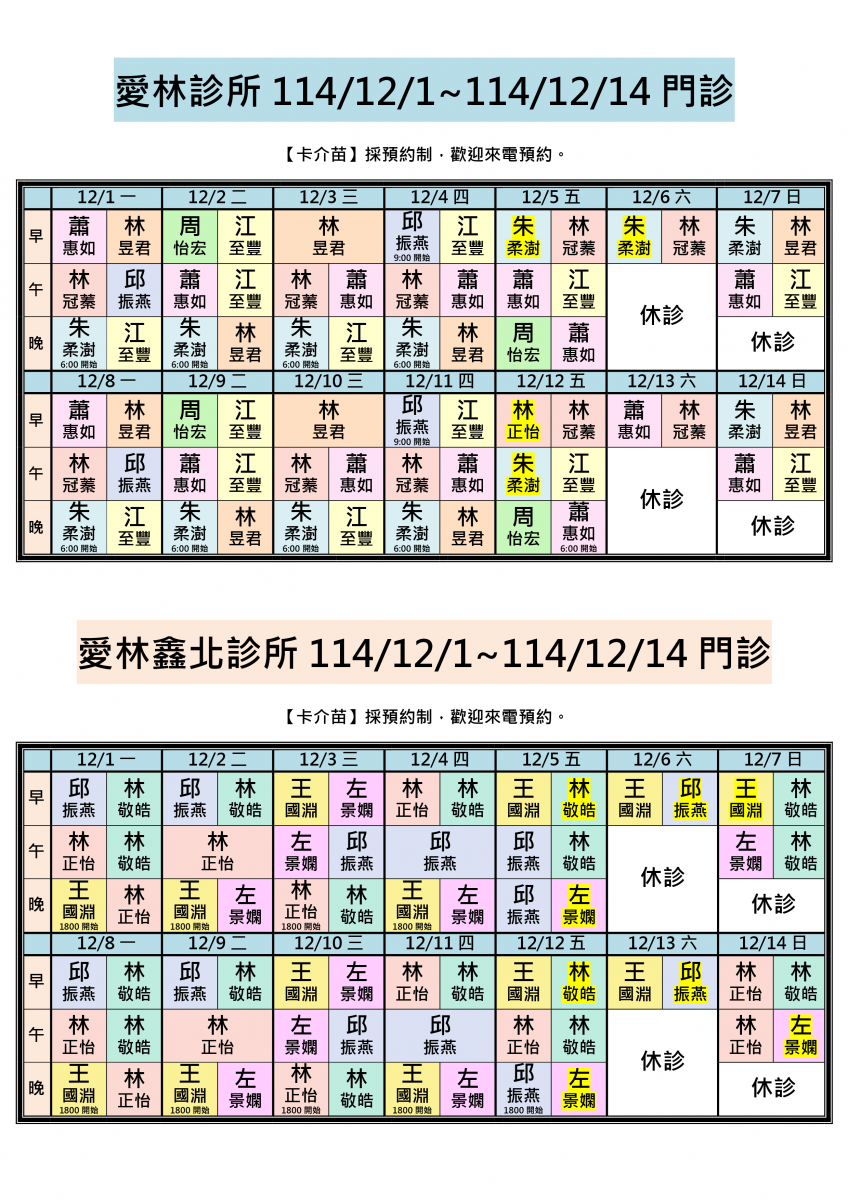 各位親愛的朋友您好:114/12/1-114/12/14兩院區醫師門診公告