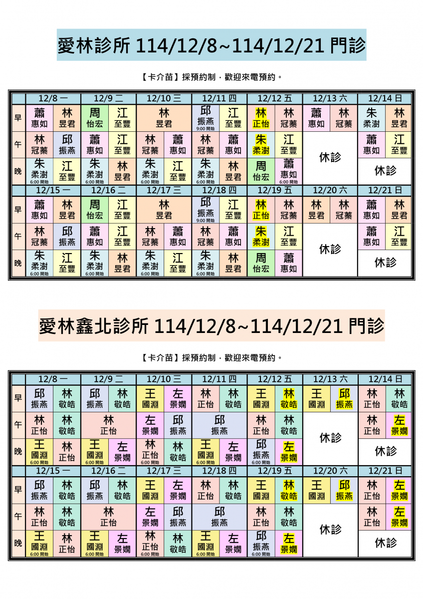 各位親愛的朋友您好:114/12/8-114/12/21兩院區醫師門診公告