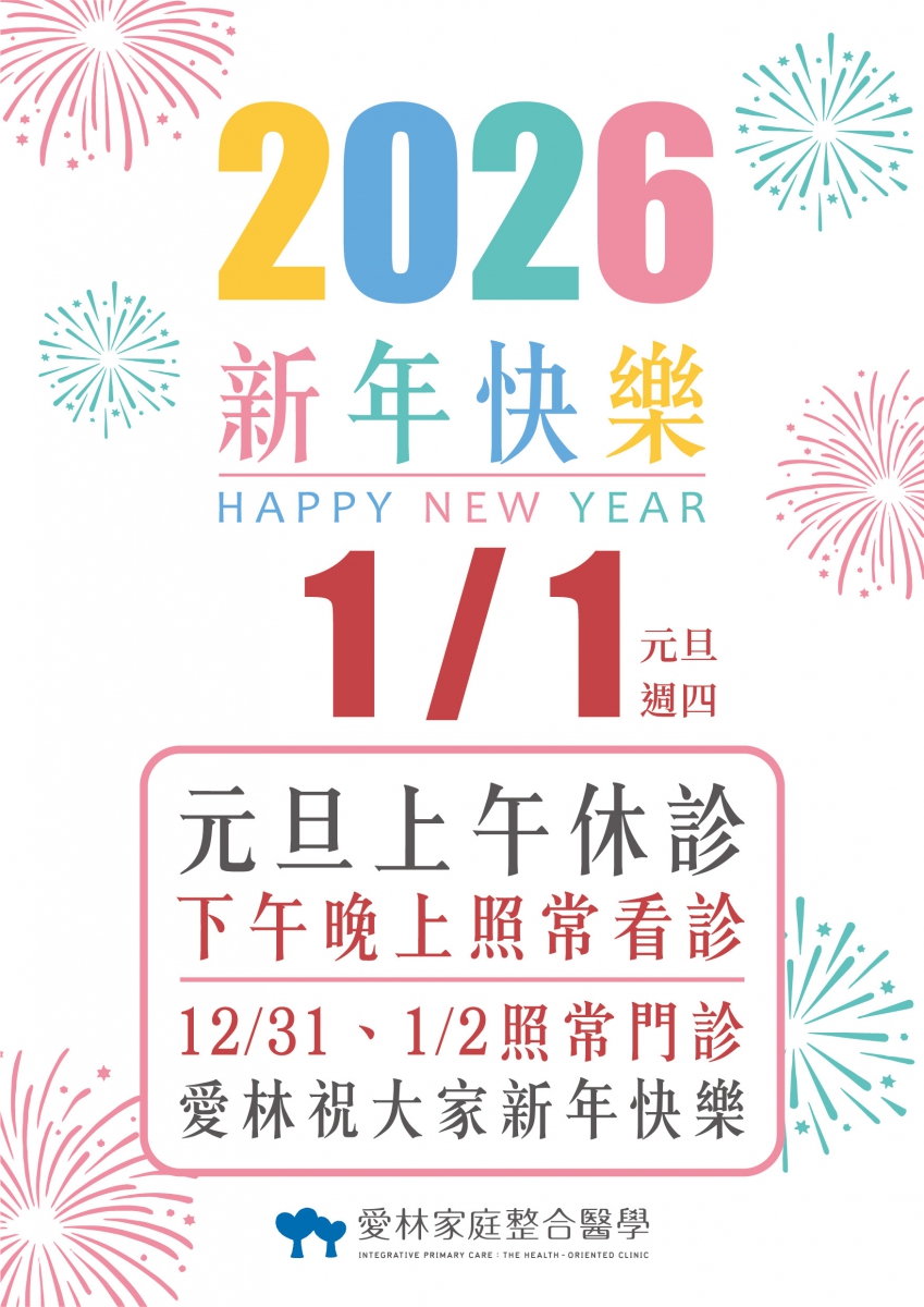 115/1/1(四)元旦上午休診,下午及晚上照常看診!愛林祝您新年快樂!