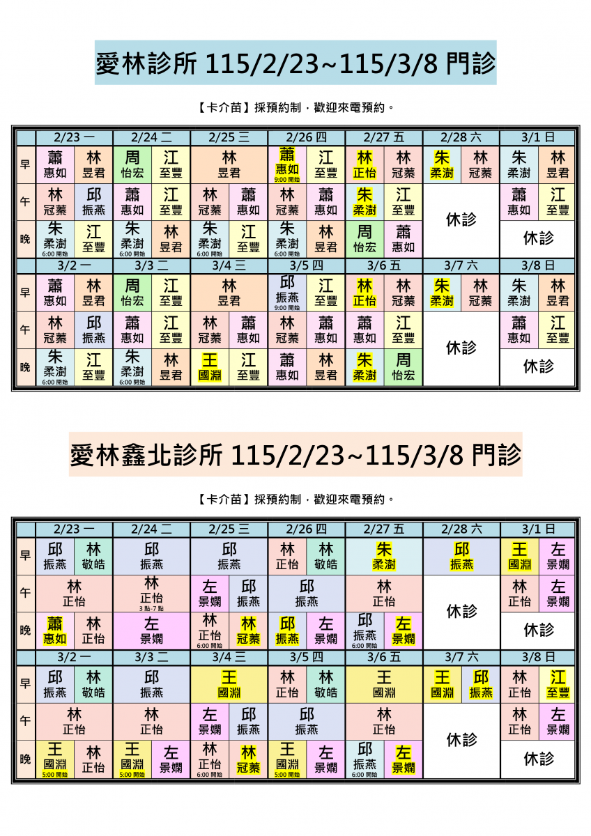 各位親愛的朋友您好:115/2/23-115/3/8兩院區醫師門診公告!