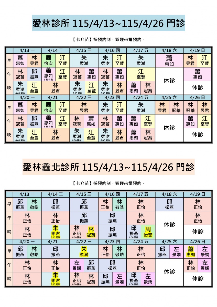 各位親愛的朋友您好:115/4/13-115/4/26兩院區醫師門診公告!